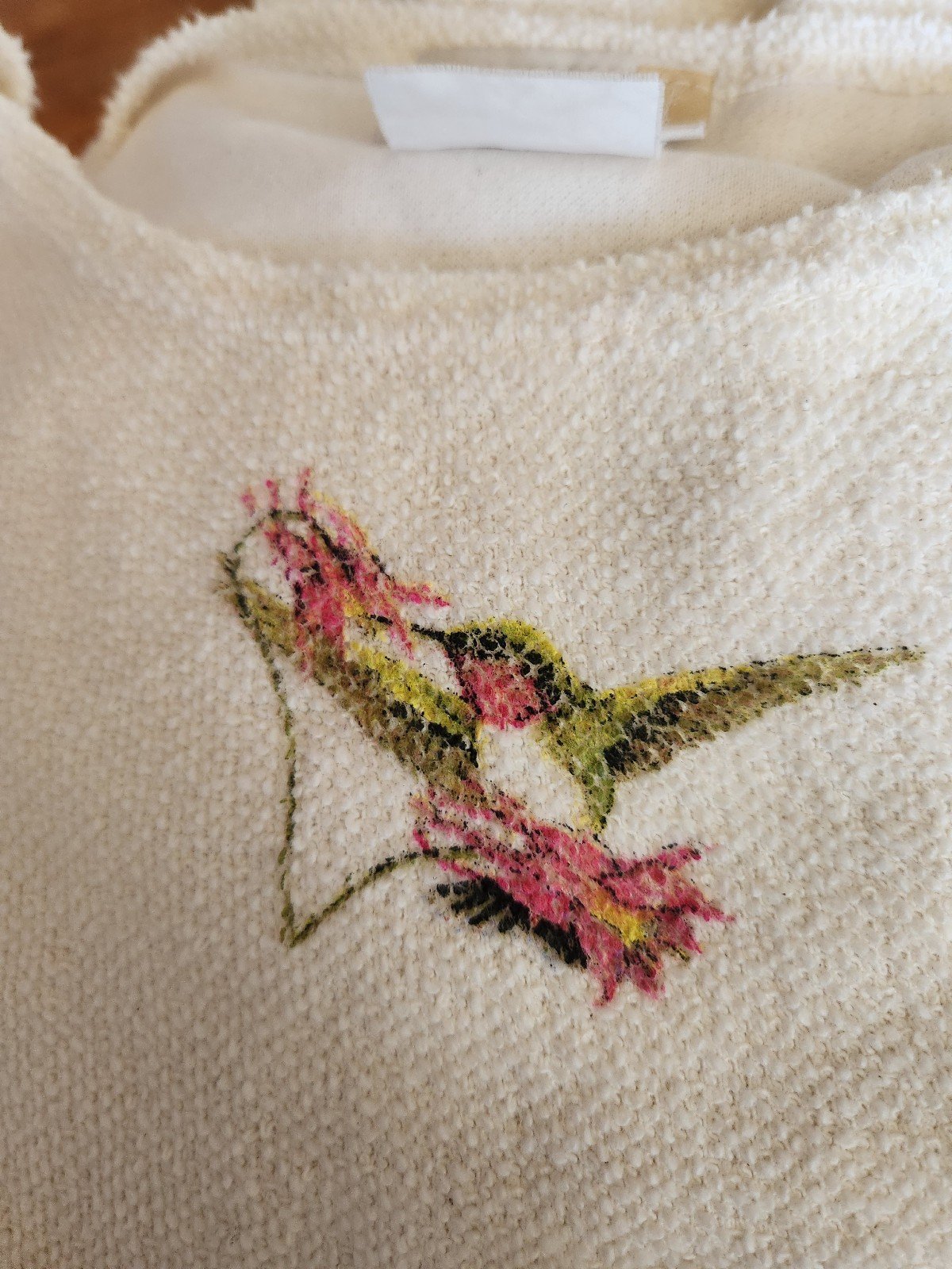This beautiful set is in excellent condition. Is a heavy cozy fabric that is perfect for one of those over air conditioned work places. Has a Hummingbird and Floral Print. Includes all 3 pieces.