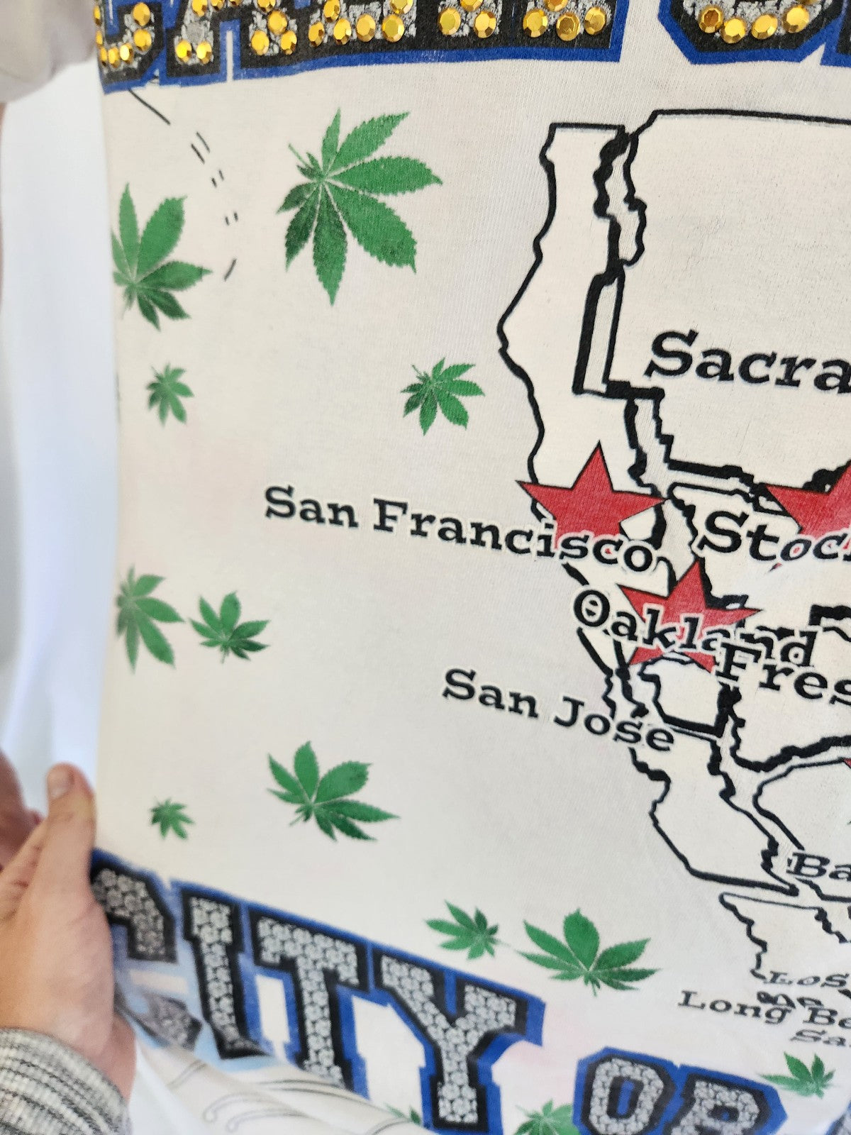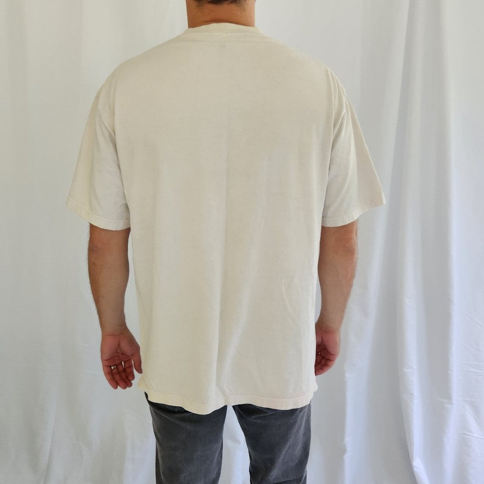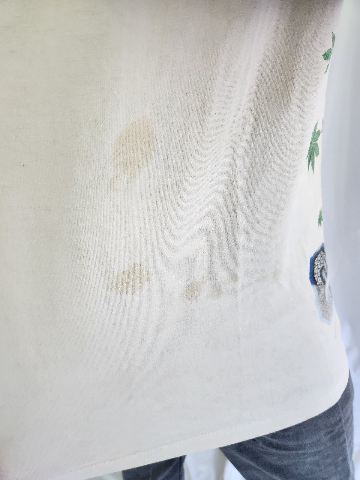 This sick tee has been well worn and has visible flaws but still has tons of life left in it. There is color bleed on the bottom as shown as well as stains on the back right side as shown.