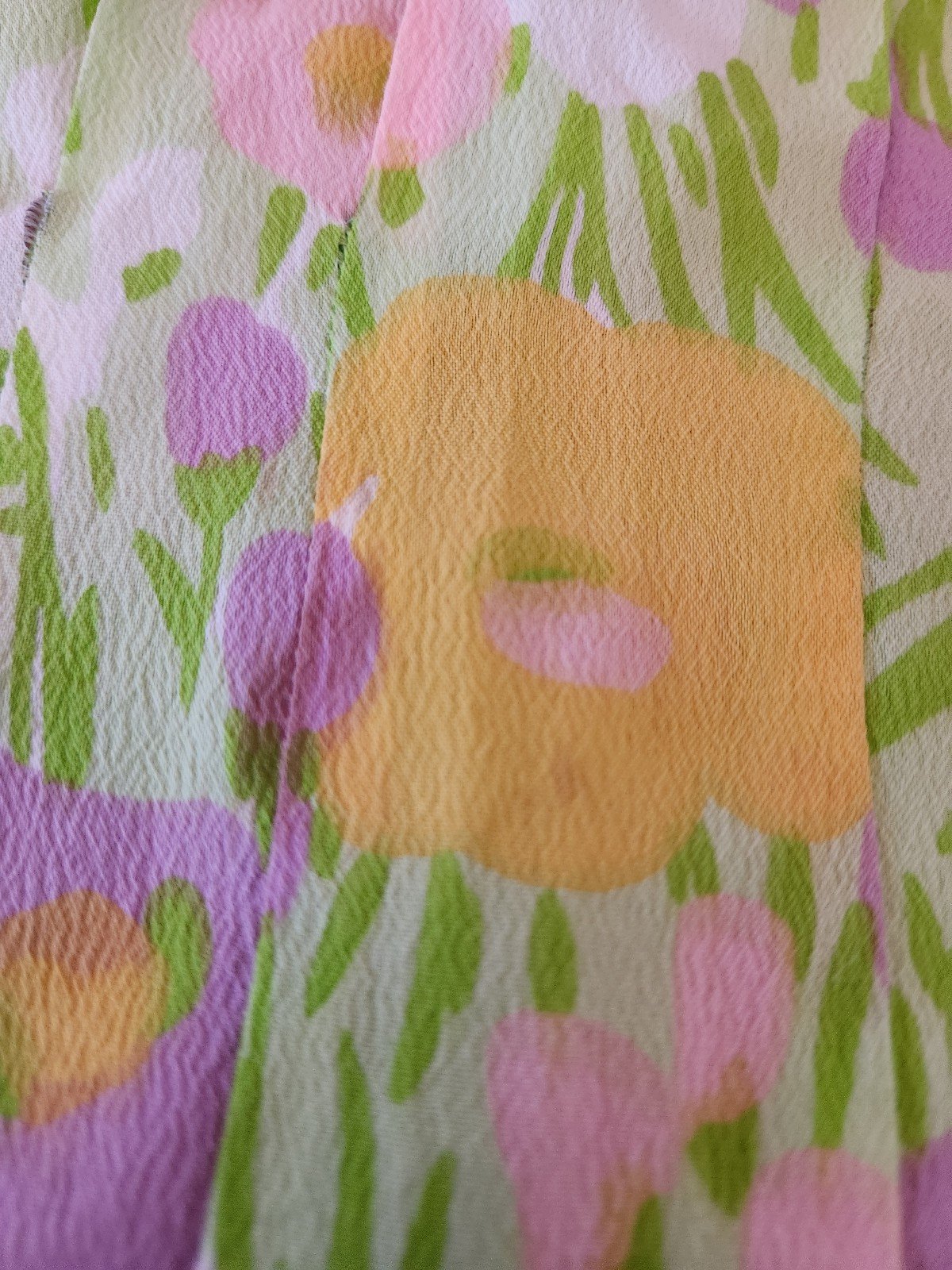 This beautiful dress is in excellent structural condition. It has two spots at the waist but the pleating and print do a great job disguising them.