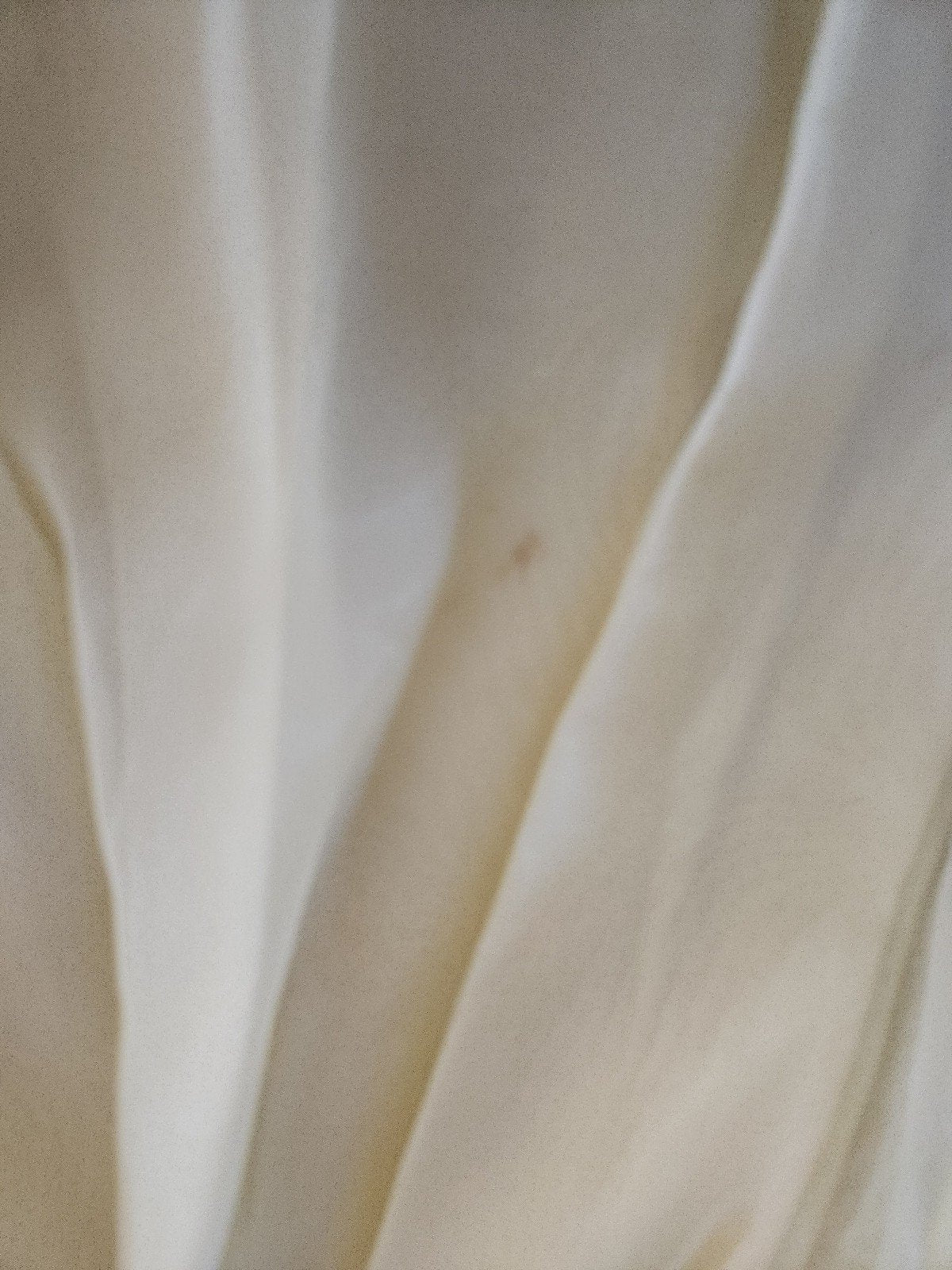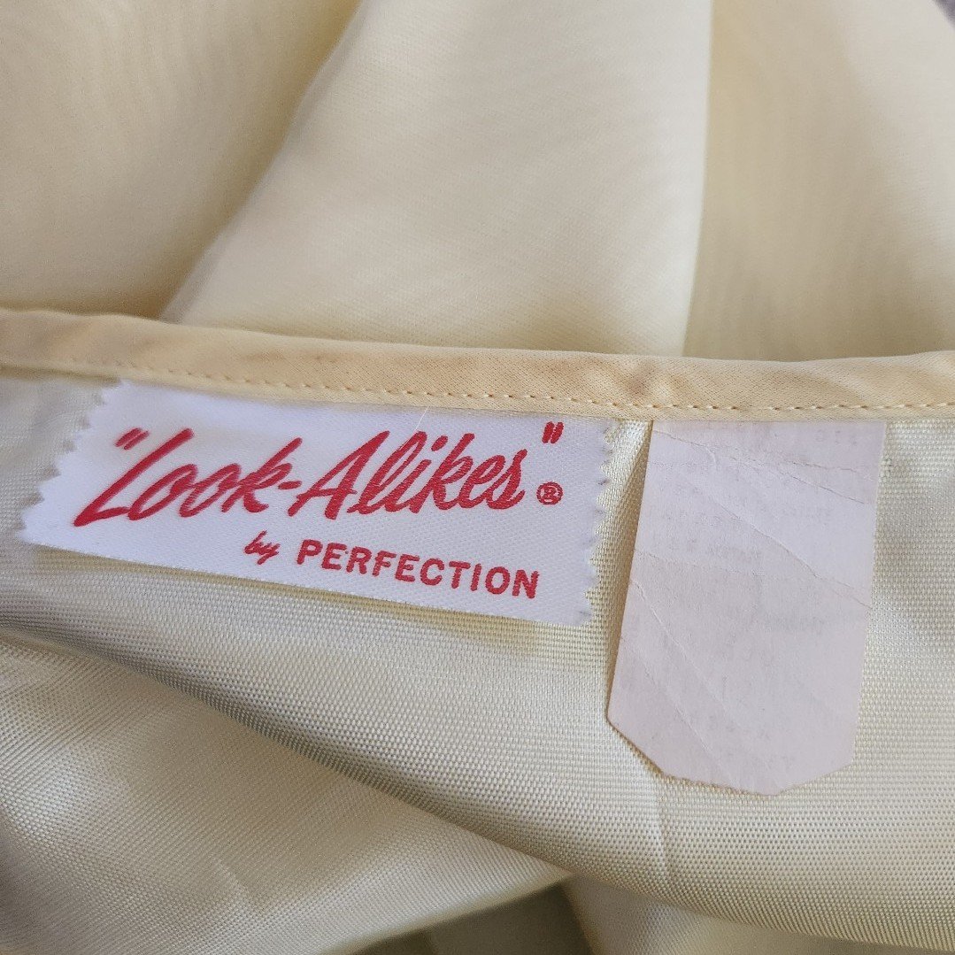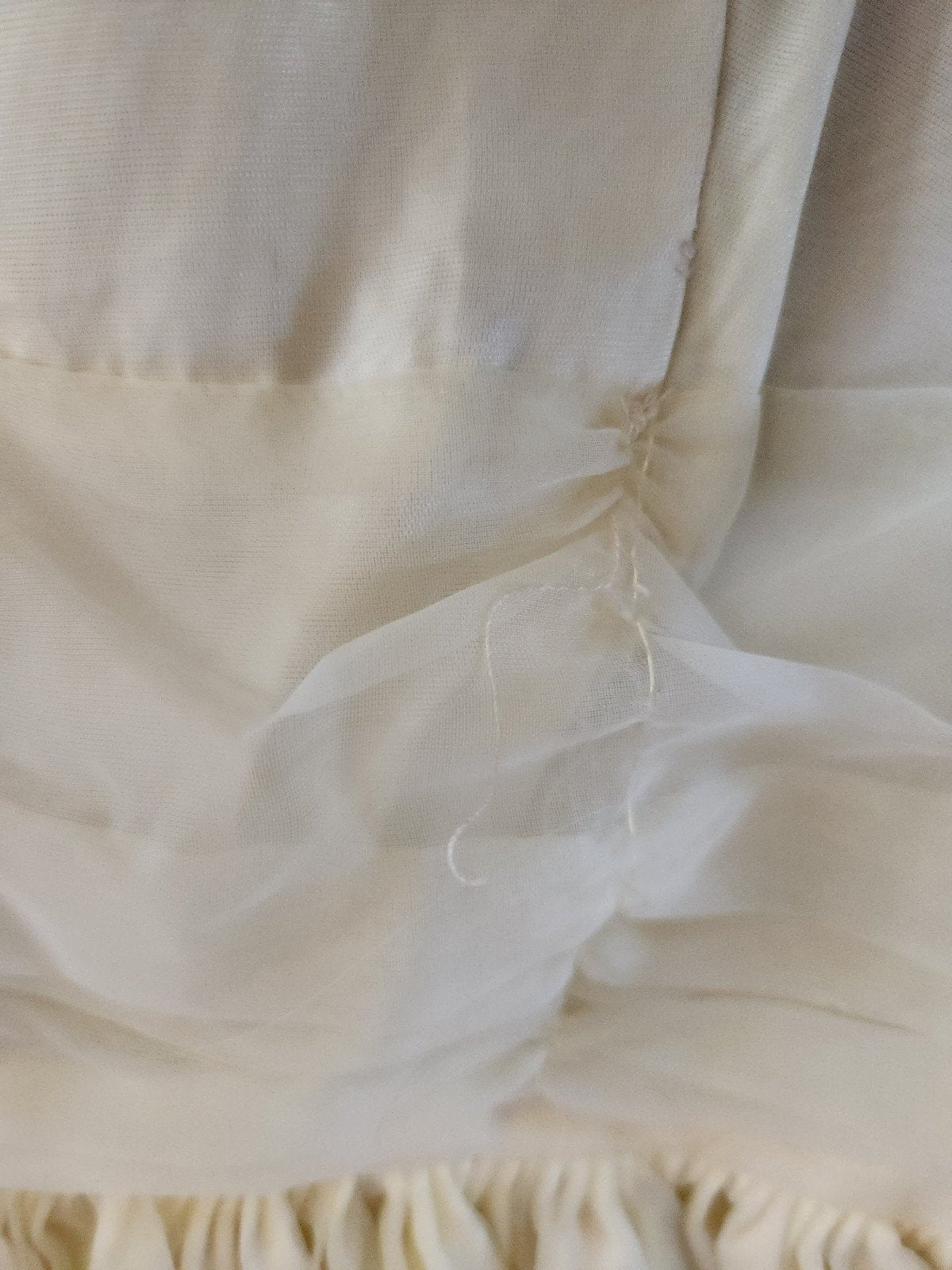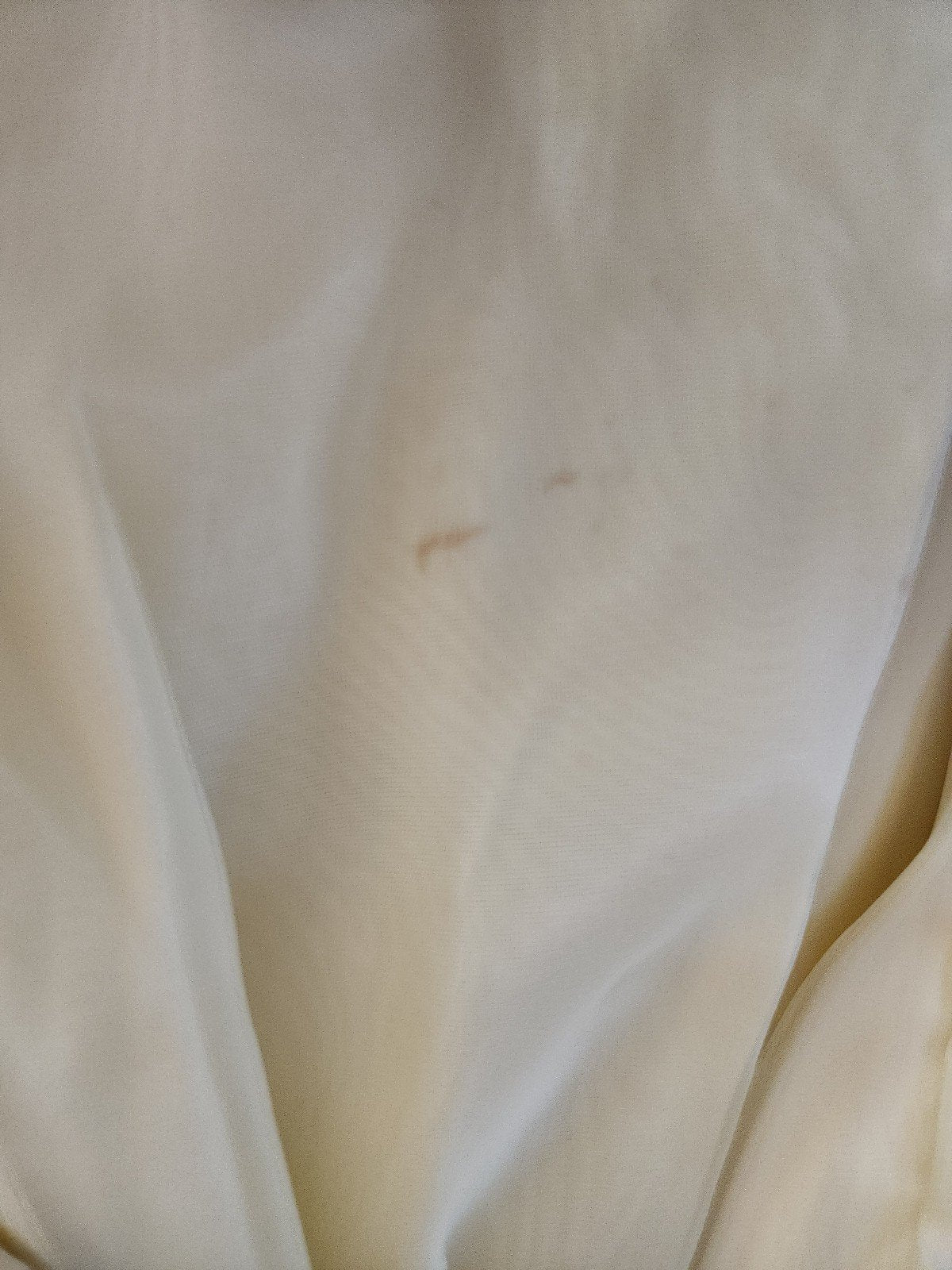 This absolutely amazing set is in very good structural condition but the skirt of the dress has a few small brown spots on the top layer as shown, as well as a loose thread on the bust.