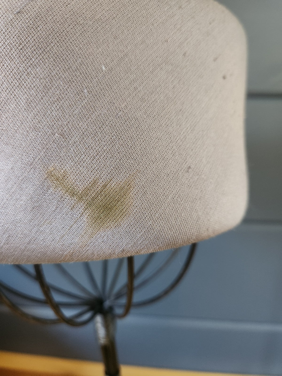 This cute hat is in excellent structural condition but has a stain as shown. I am unsure of the fabric or whether the stain could be removed.