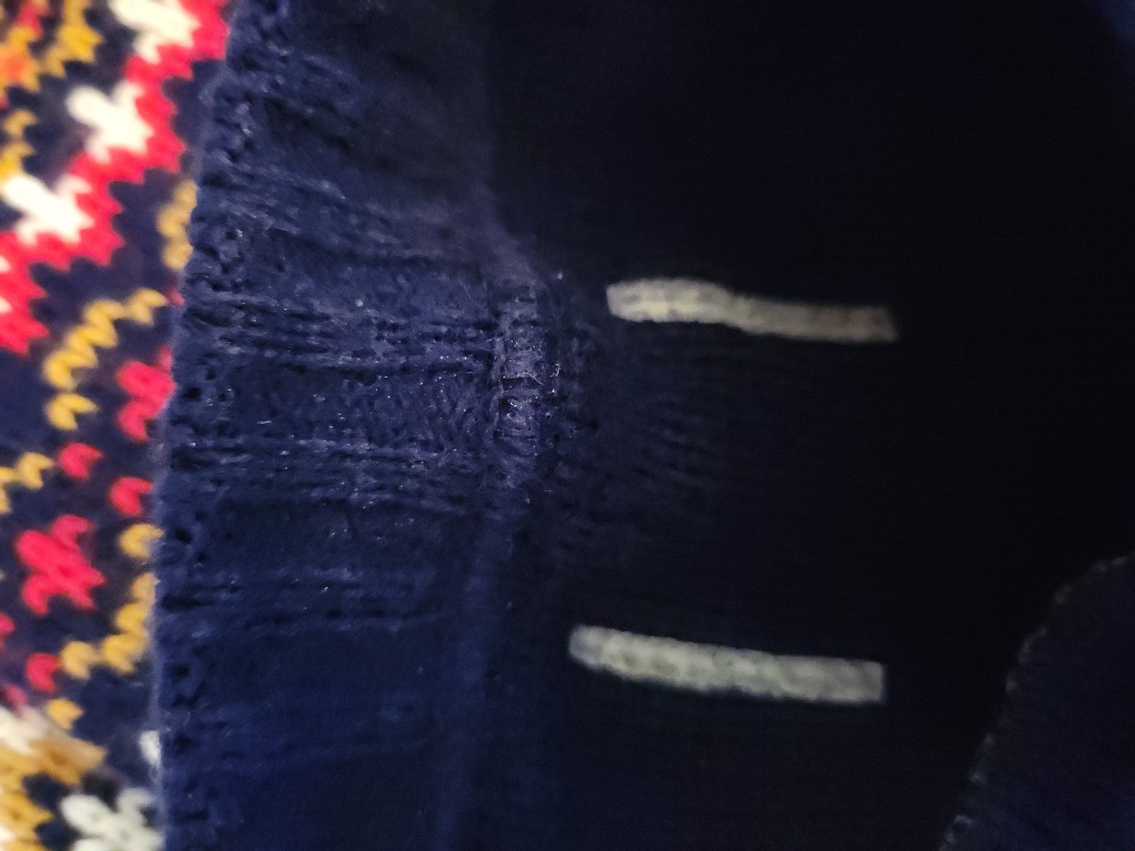This cozy sweater is in very good condition, but the one thing I will note is that the head hole is snug, and this doesn't have much stretch at all. Likely acrylic.