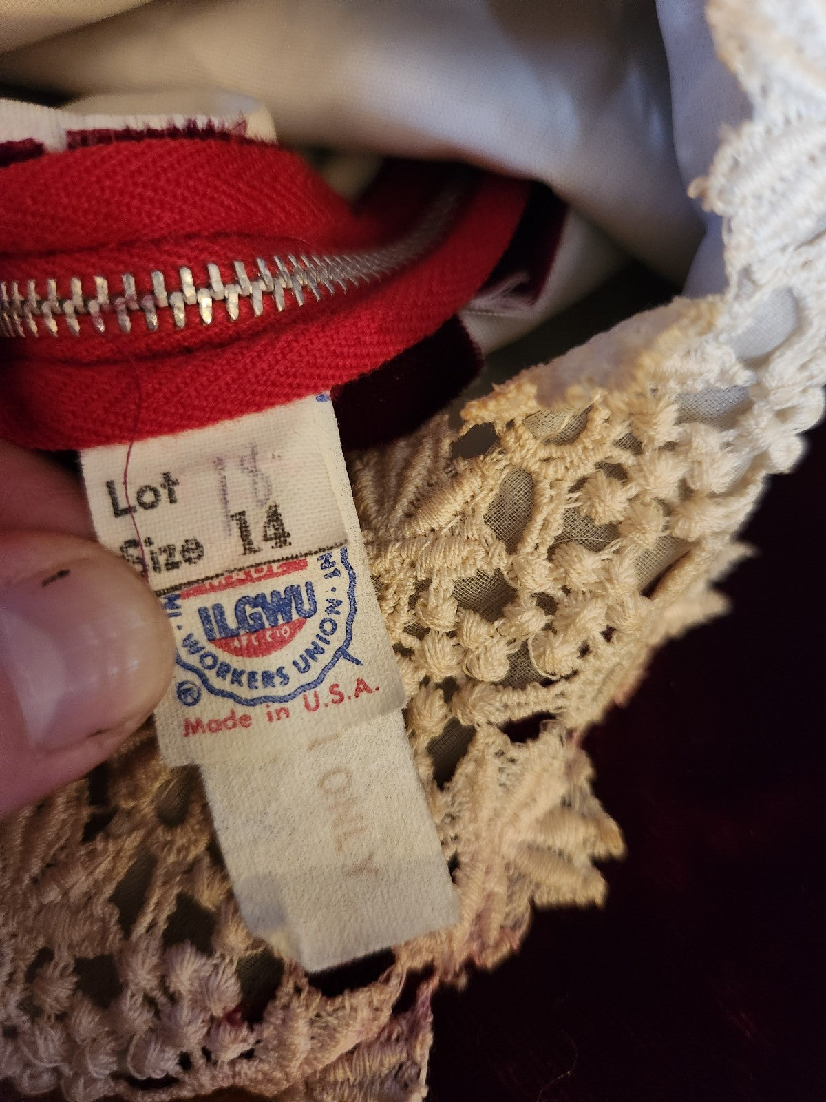 This beautiful dress in in very good condition. Some of the cream lace has picked up some color bleed, but it is very faint.