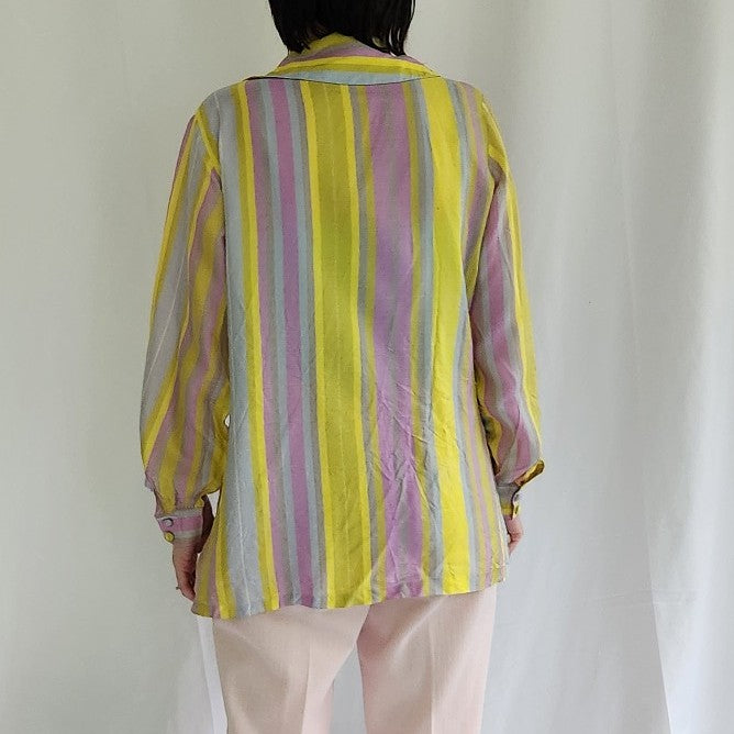 This fun, funky, and lightweight top is in excellent condition except for the missing original belt. Wrinkles easily, I did lightly steam it after washing.