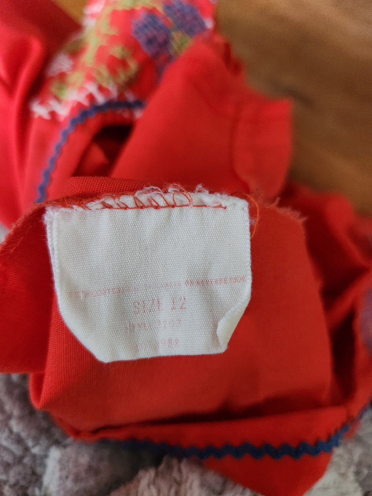 This fun robe/dress is in need of a little TLC from Someone who enjoys embroidery. The stitching is fully intact on the left pocket but needs some help on the other pocket and chest. There is a oil type stain on the front chest as well.