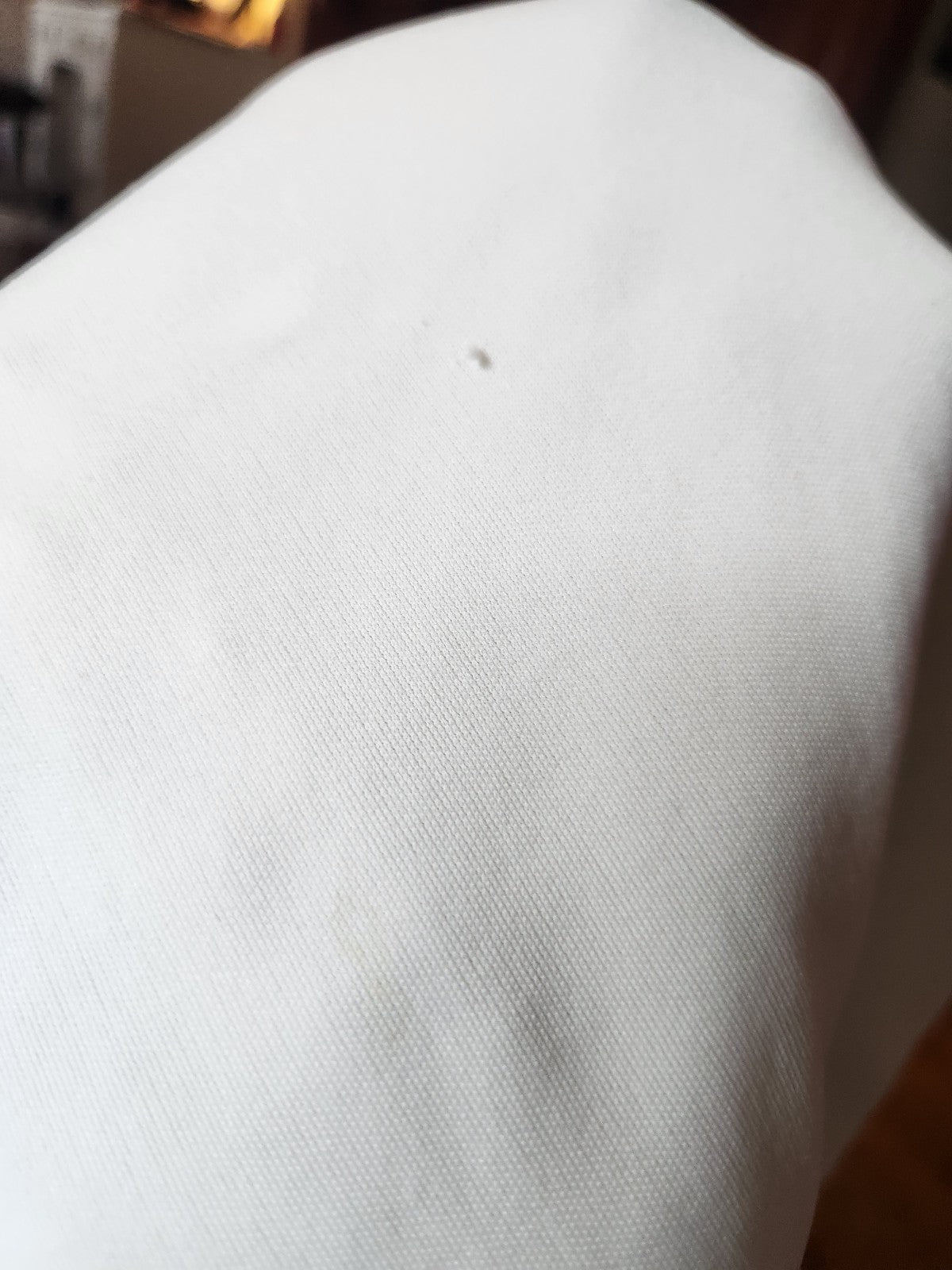 This tee has a couple minor flaws but will be a great layering basic for you 70s fits. There is a super light yellow stain on the front of the chest near a tiny pull in the knit. The stain was difficult to even get on camera.