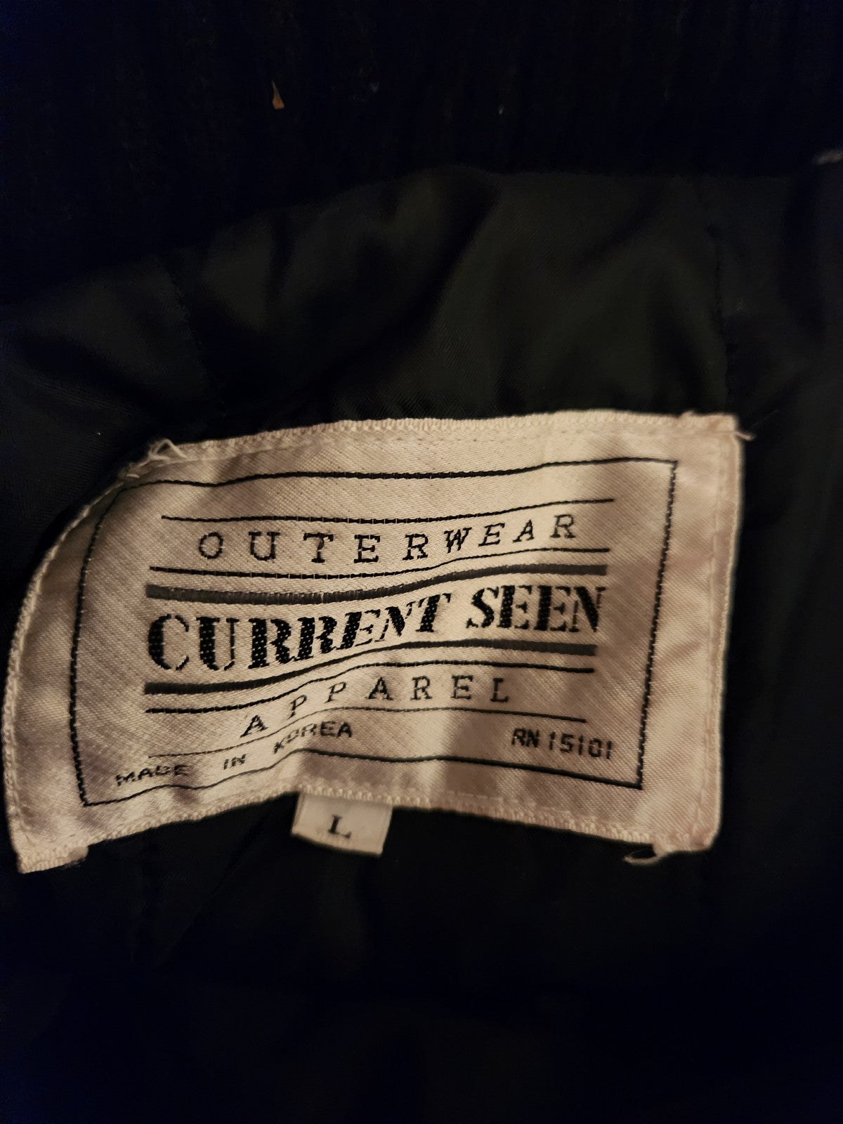 This cool coat is in good condition. It has some typical pilling as is common in acrylic knits. The two buttons clasp with elastic bands, kind of similar to a hair tie. Unfortunately the top elastic has relaxed. I do not keep elastics like this on hand to replace it.