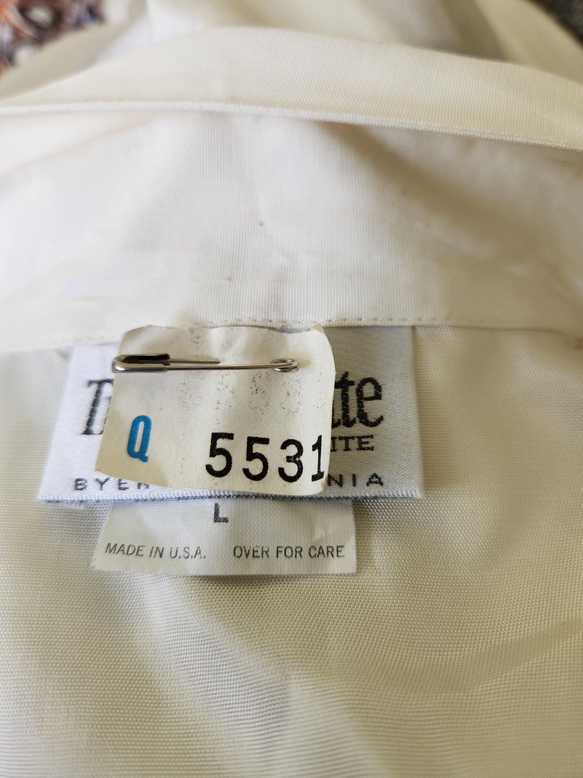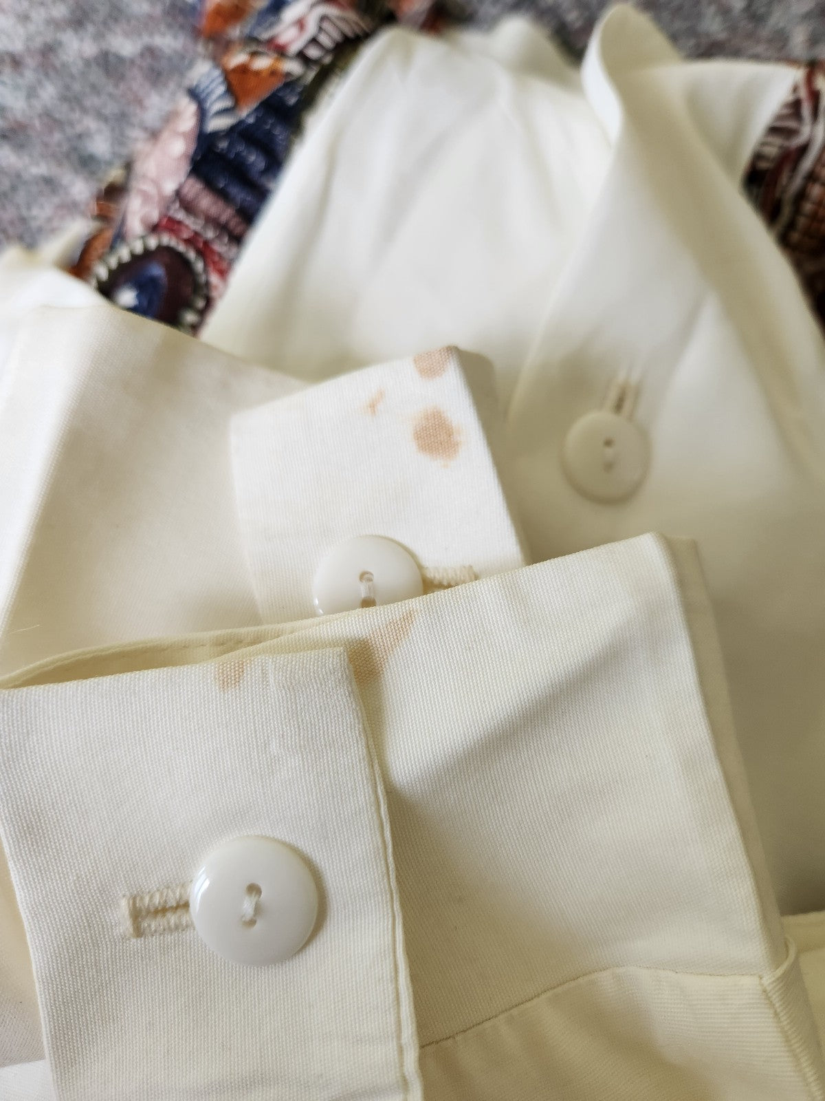 This cute piece came to me with dry cleaning tag still attached. It is rayon and acetate. It does have spots on the wrists that did not come out.