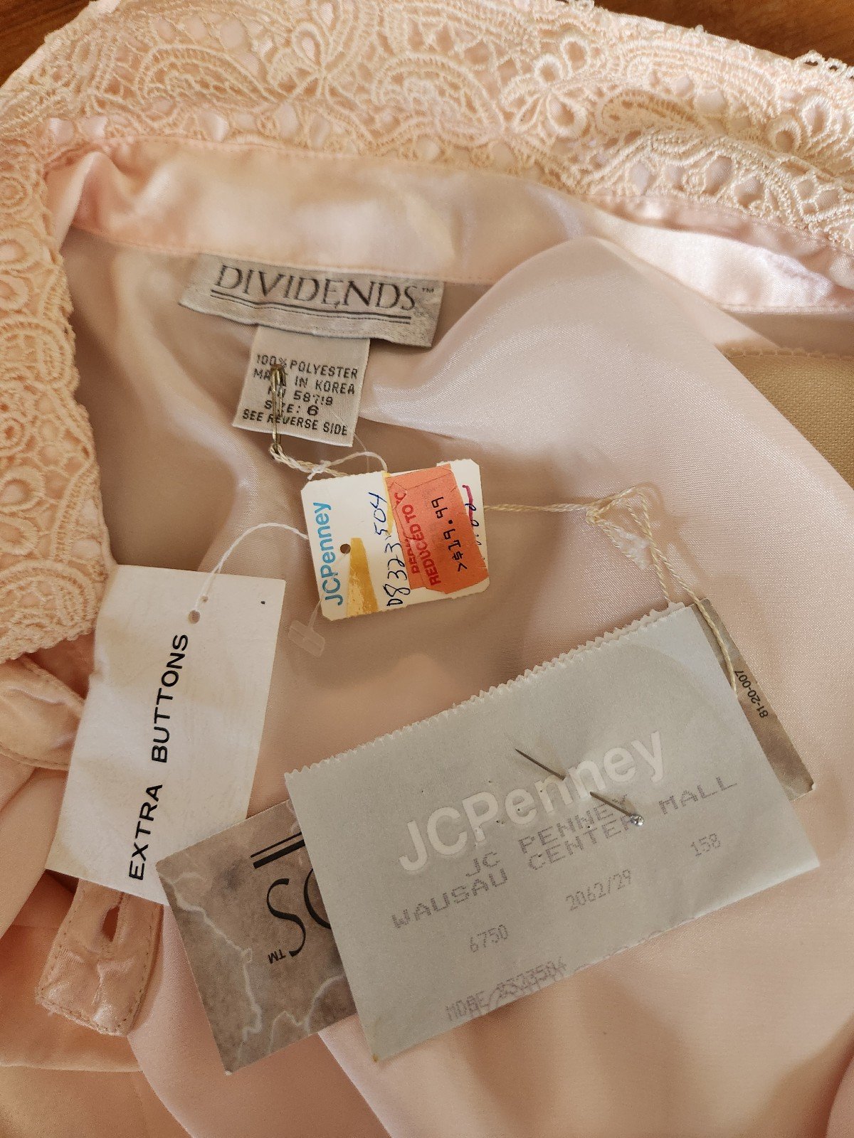 This pretty polyester Blouse is in excellent condition except for the small flaw shown. One button at the collar popped off which is why the Frilly tie is a little off, but I will put the button right back on. The Frilly piece is completely removable.