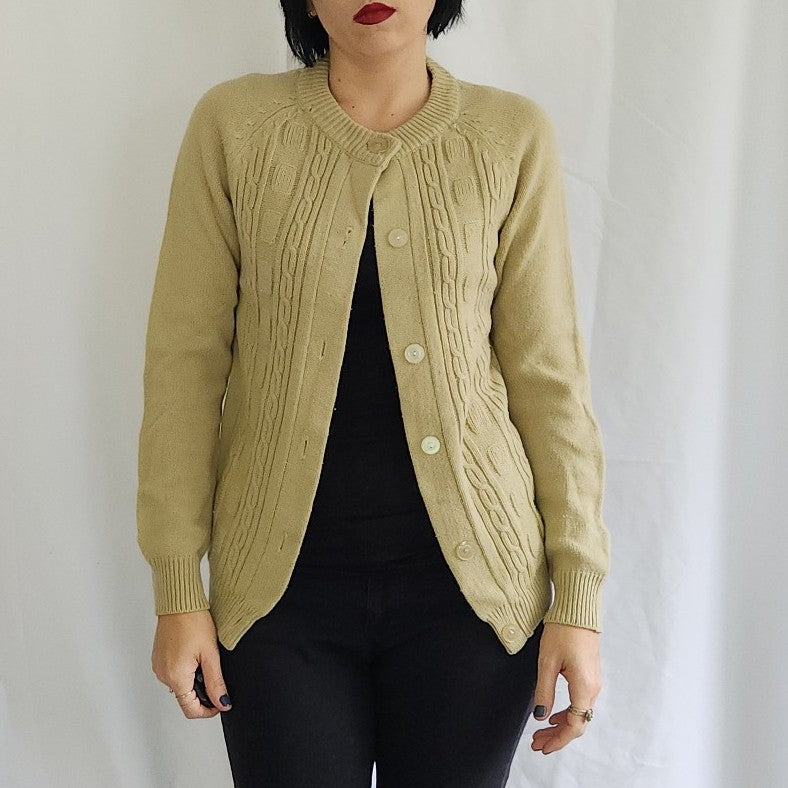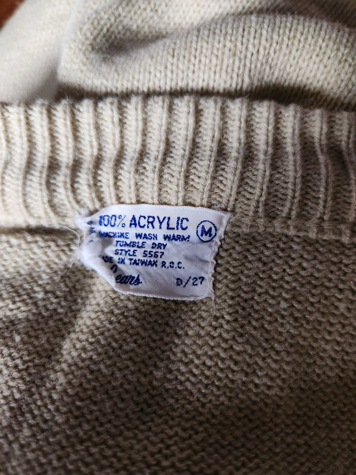 This cozy oatmeal colored Cardigan is in good condition. Has some mild pilling typical of acrylic knits.
