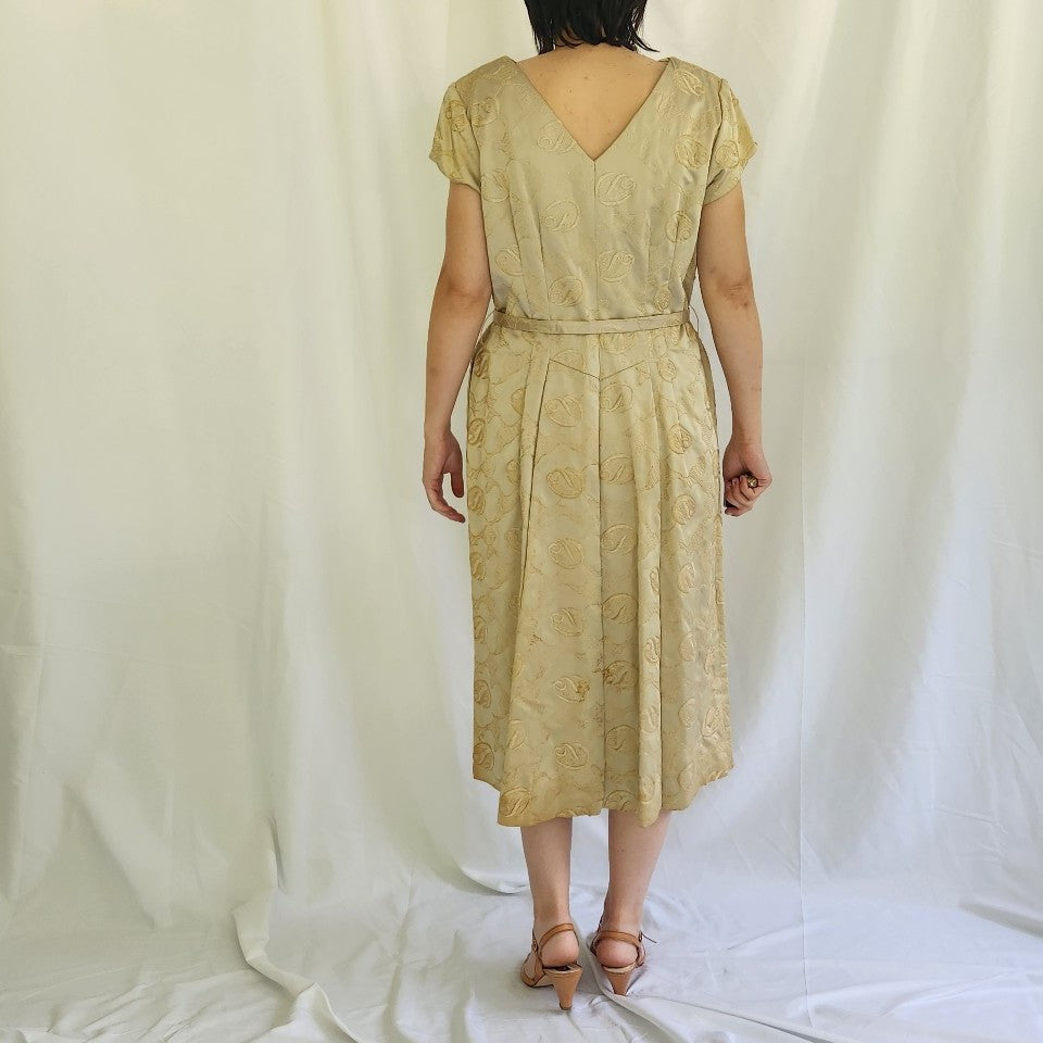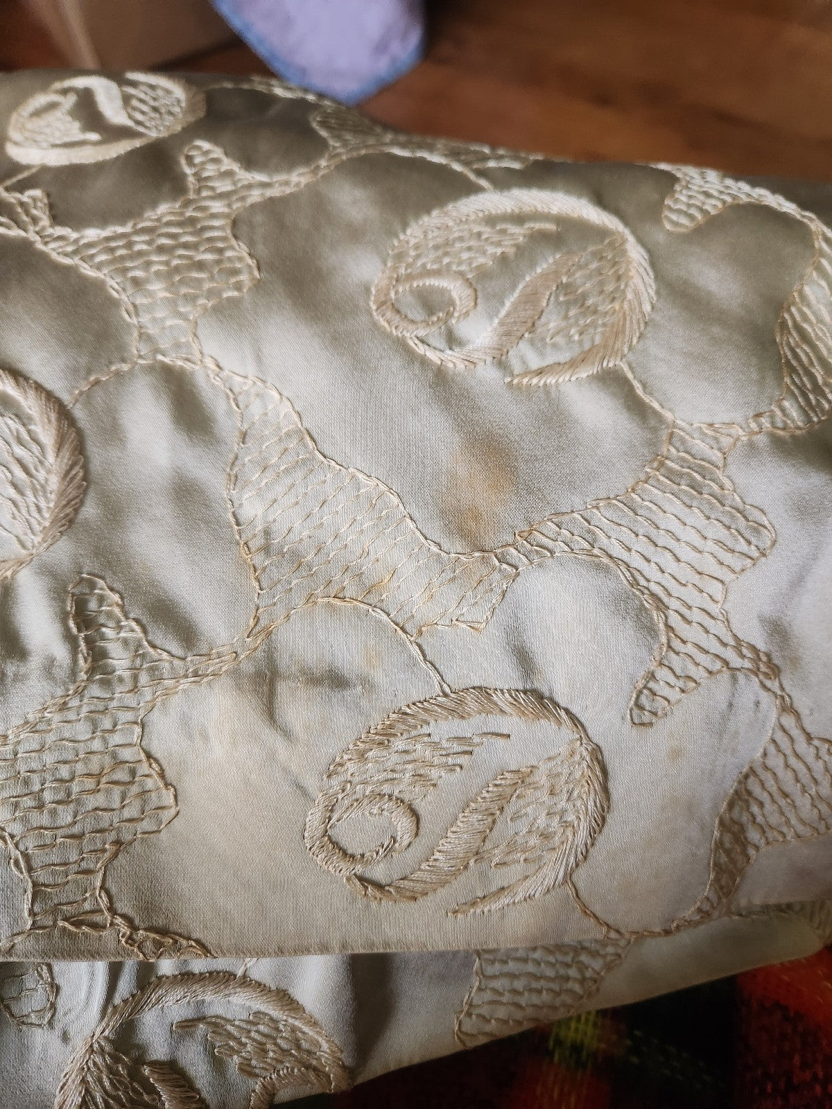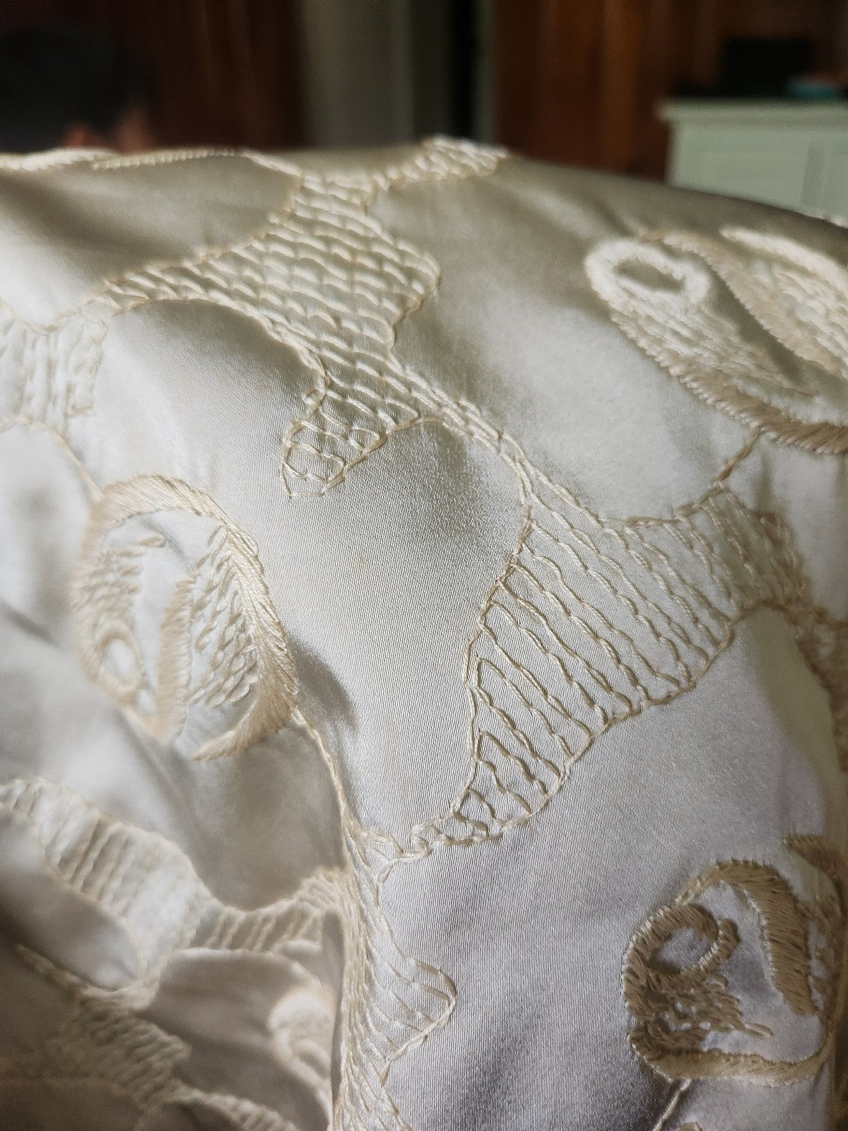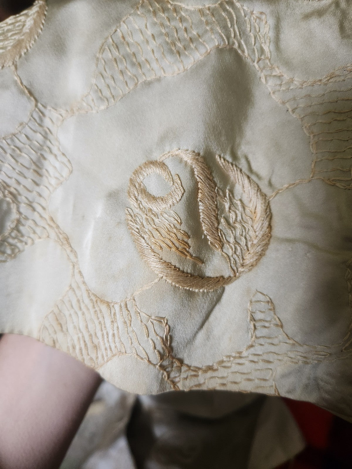 This pretty hand made dress is in very good structural condition but has some discoloration that I have shown. I have not attempted to treat any of it as cleaning this fabric is out if my comfort zone and I no longer have a dry cleaner in my town.