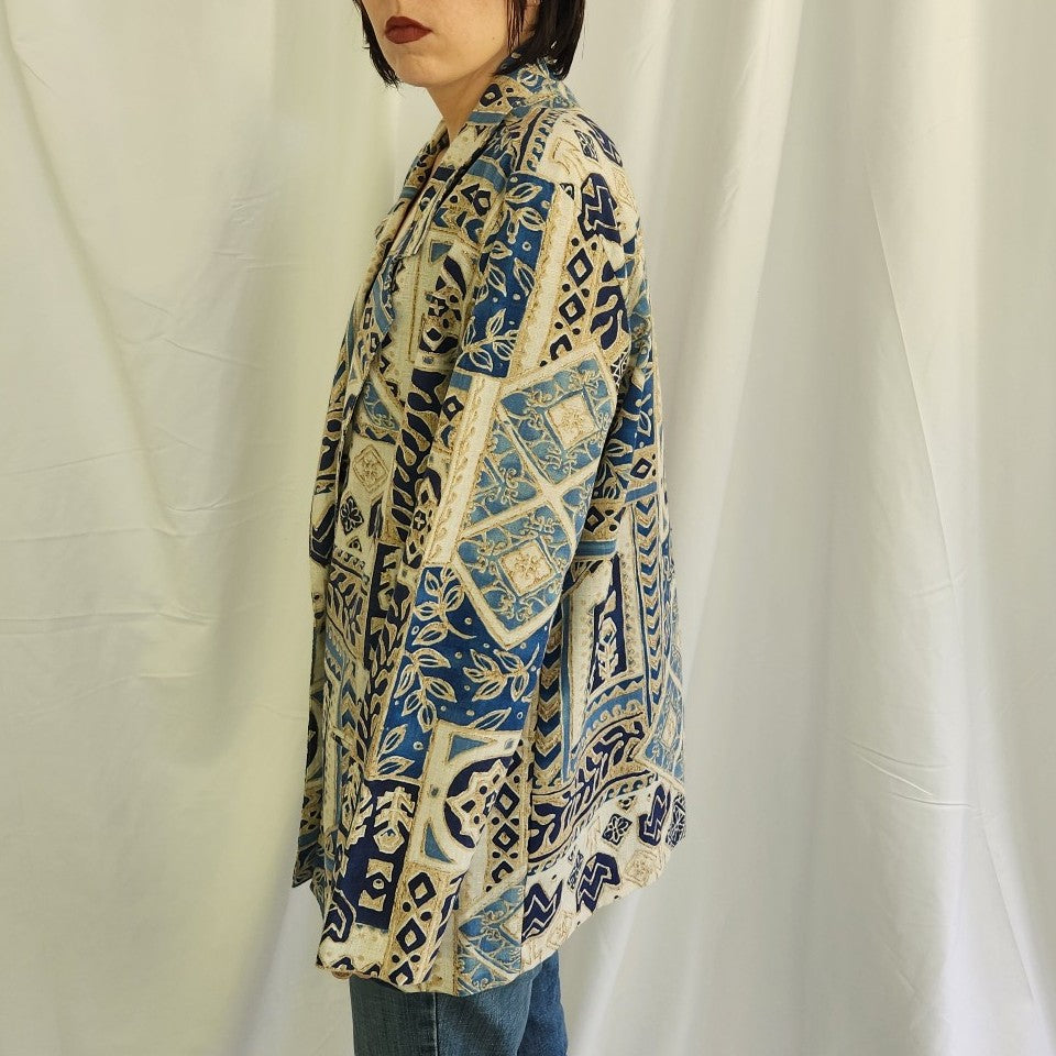 This lightweight, unlined rayon and poly blend Blazer is in excellent condition.