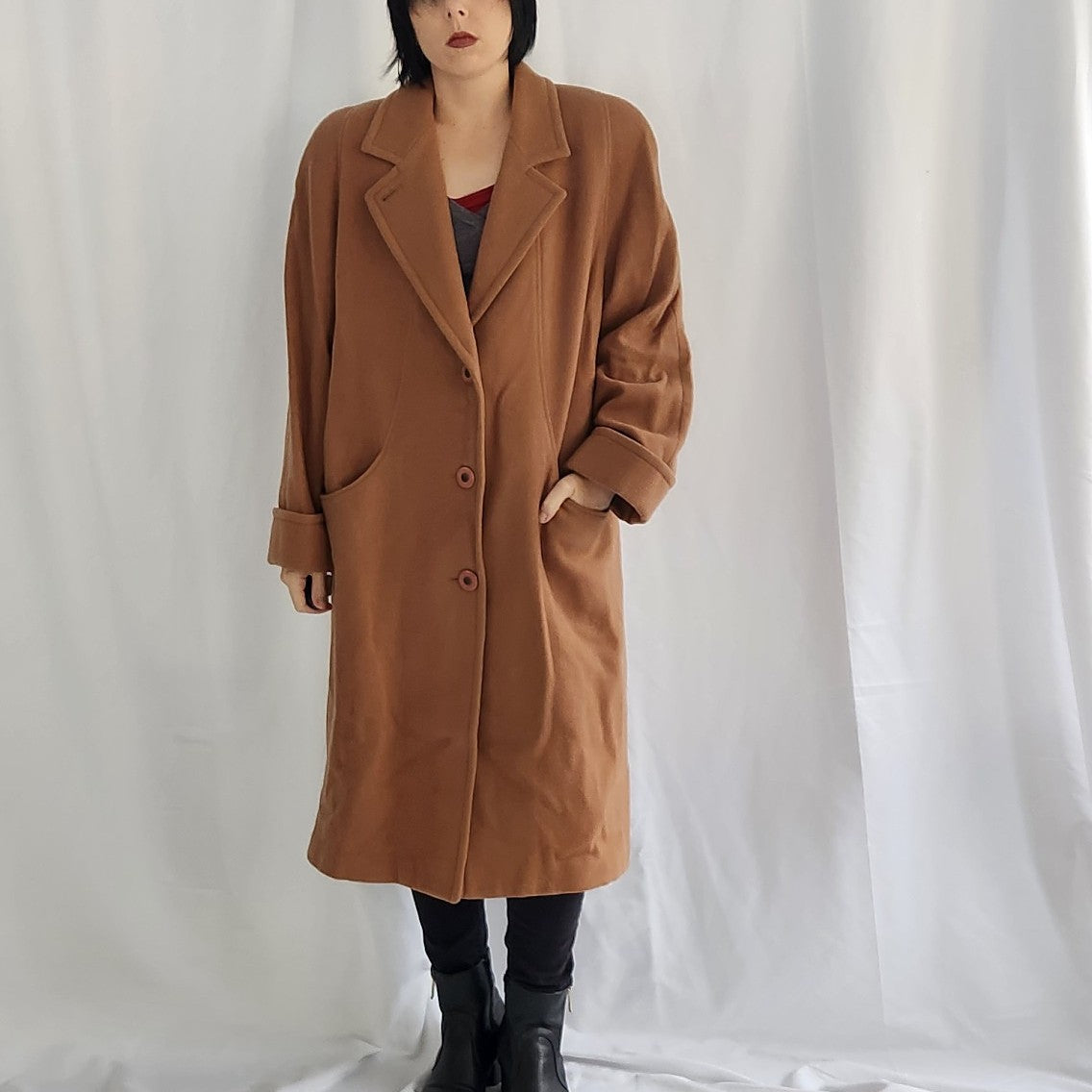 This lovely coat is in good condition though has two very small thin spots in the knit at the right shoulder. Is rumpled simply from having been stored folded.