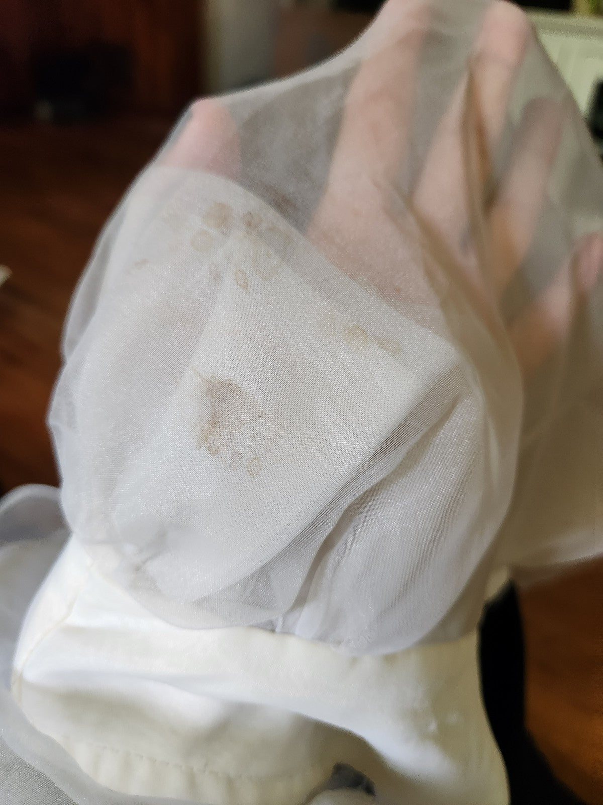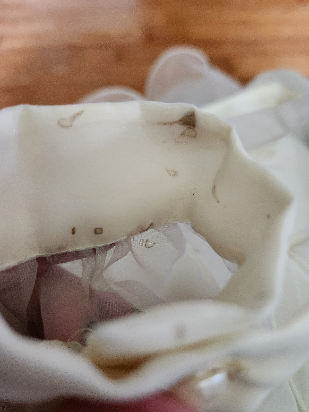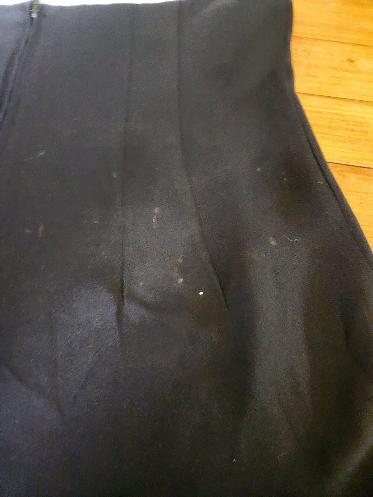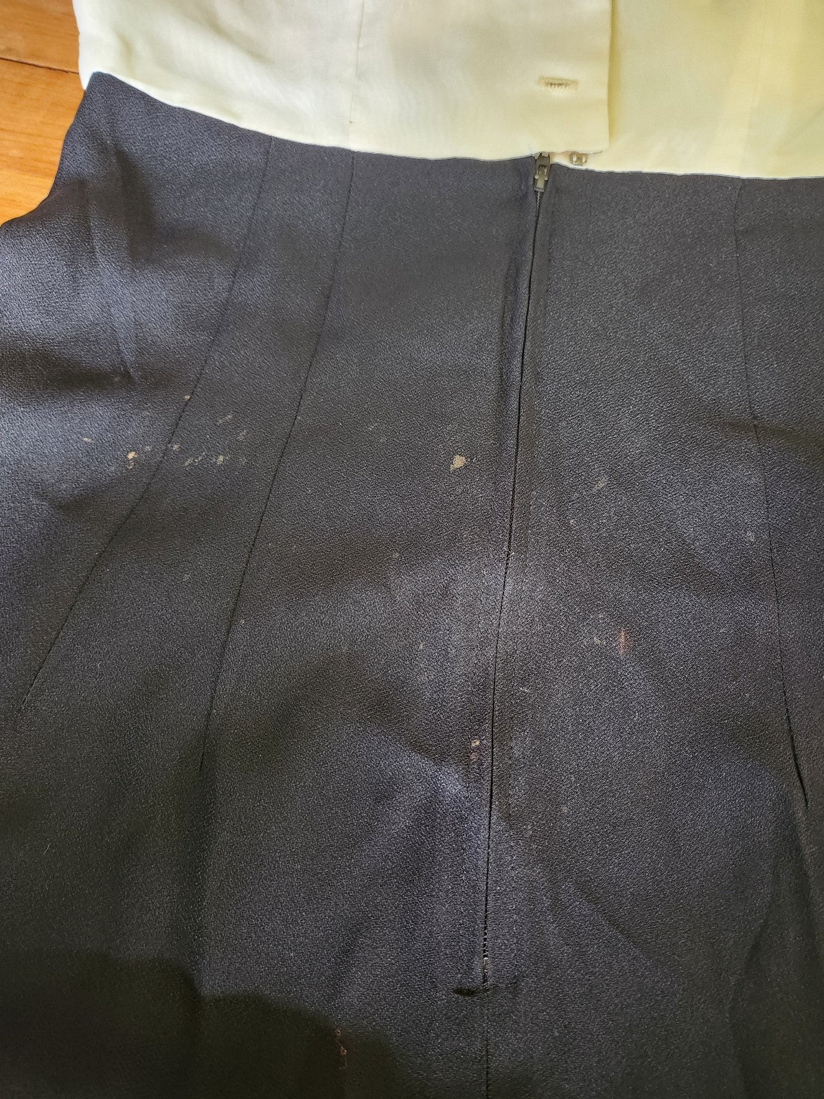 This striking dress is absolutely giving me Aunt Hilda vibes from Sabrina the Teenage Witch. In excellent structural condition but does need dry cleaning. It has some brown spots as shown, and I feel quite comfortable saying a dry clear should be able to handle them well, but unfortunately I no longer have one where I live.