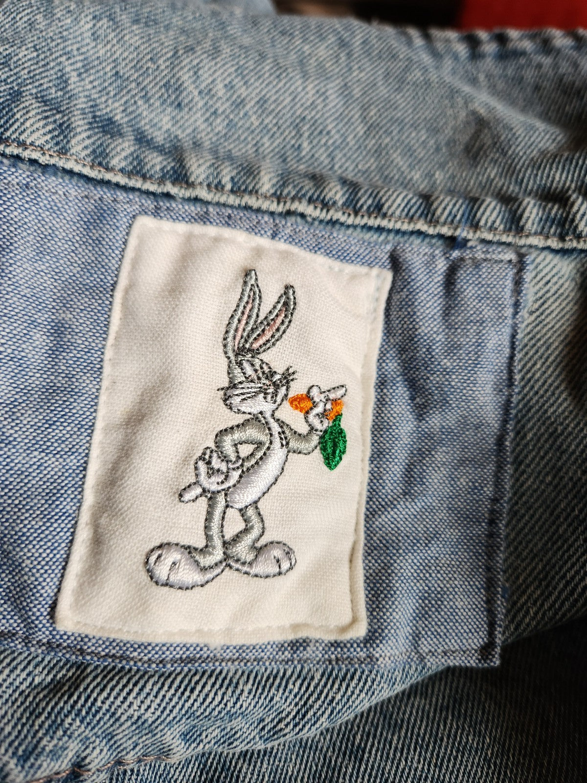 This rad jacket has been well worn but has tons of life left. Has had a bugs bunny patch added on the back as shown. Inner collar shows wear and there are some small light stains on the shoulders that did not come out in the wash.