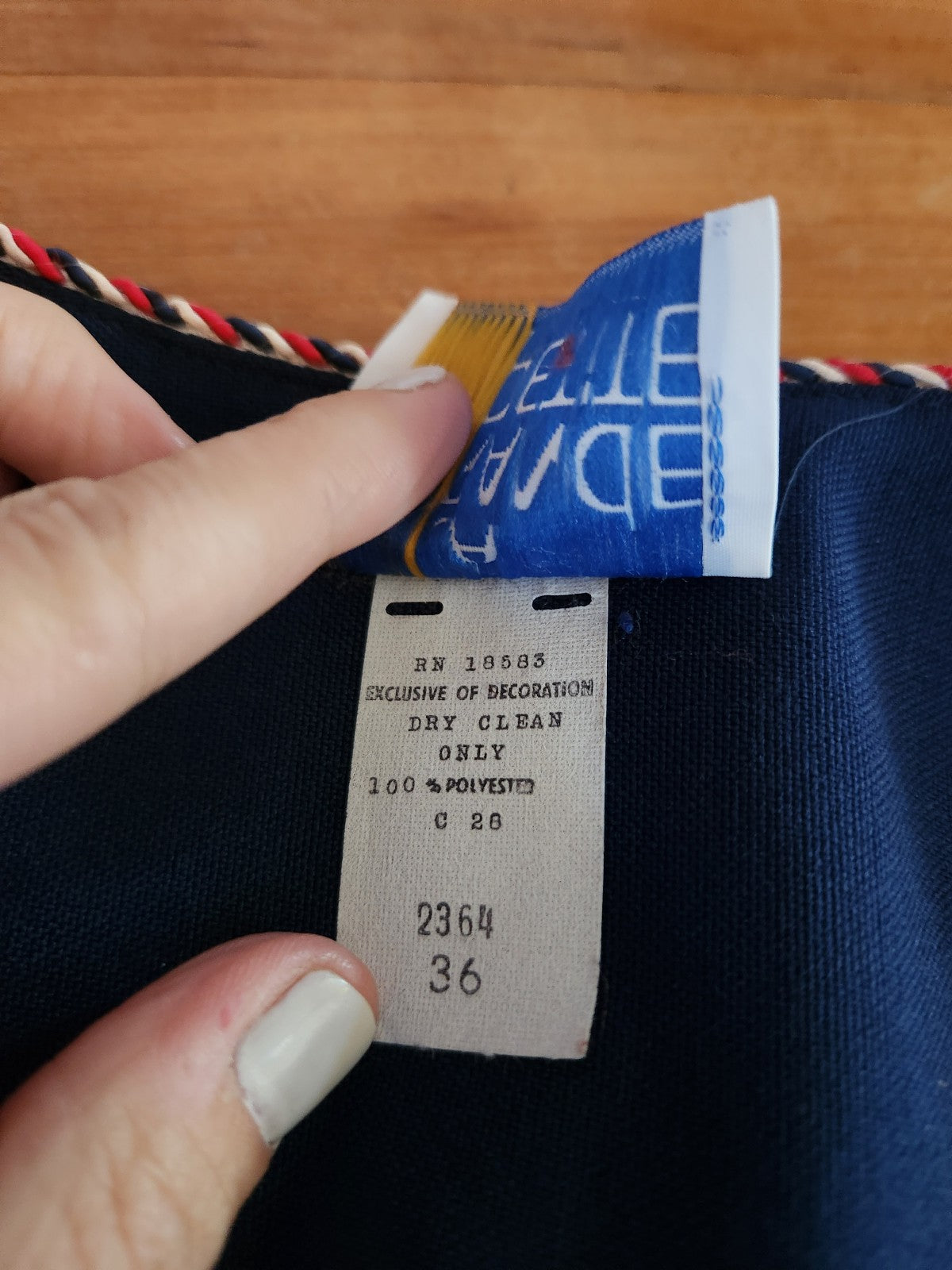 This cute suit is in very good condition. The lining has some discoloration but it doesn't affect the garment at all. Jacket has no closures.