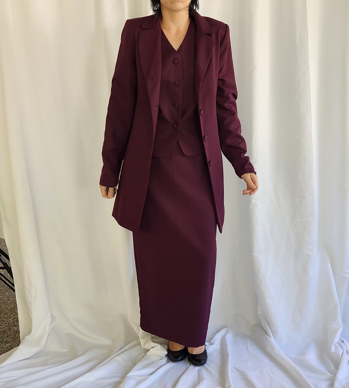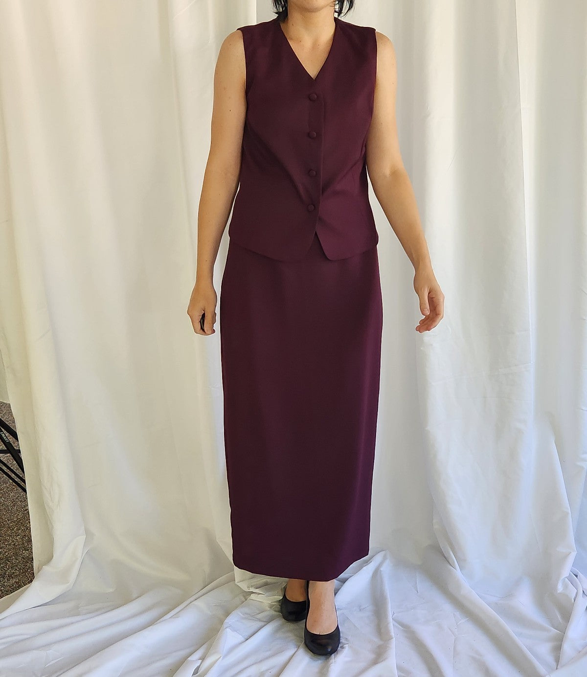 This lovely set is like new and includes Trousers, a skirt, a Blazer, and a Sleeveless Top. All are tagged an 8 tall and fit like a 6 tall. All are in excellent condition.
