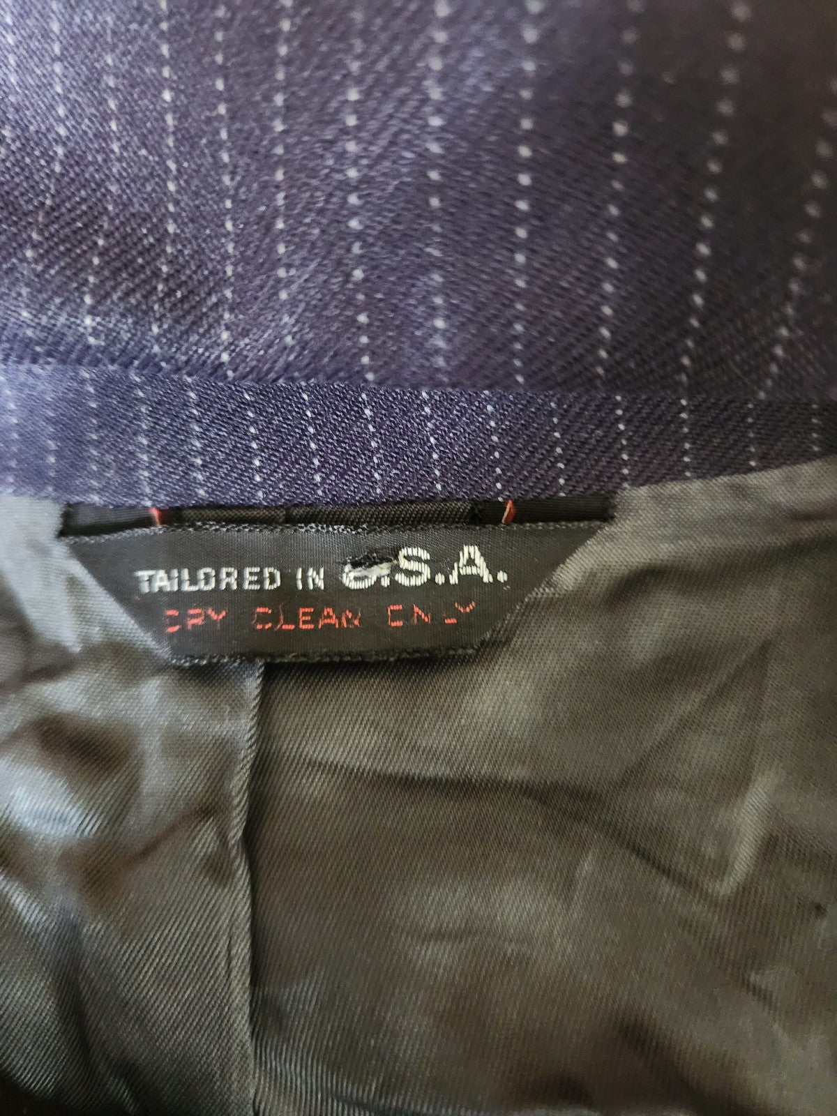 This suit is in great condition. I've washed it so the lining in the jacket is wrinkled. This suit feels polyester to me.